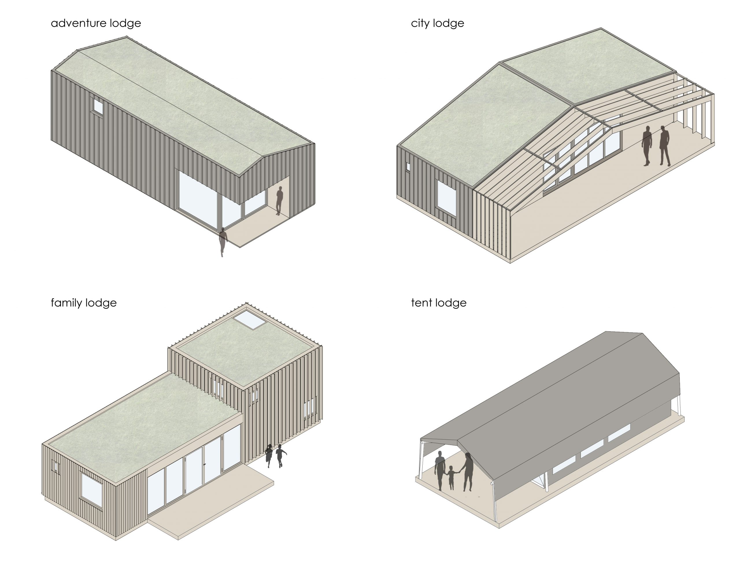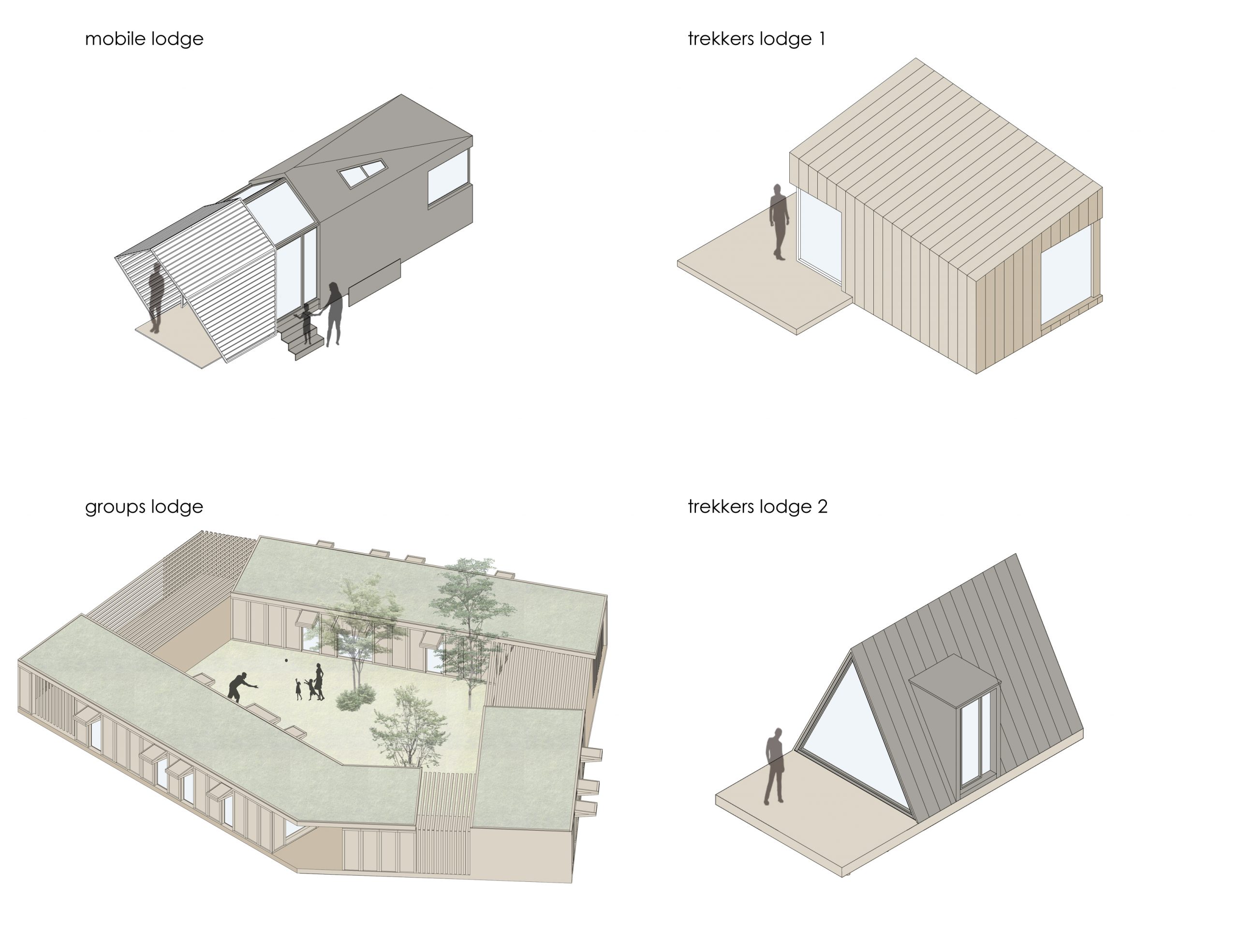 Within the citadel, the village area, crisscrossed by smaller pathways, will house the larger, modular, transportable lodges. North of this village, the design transitions smoothly into a forested area where smaller huts are integrated with the natural environment, accessible via an elevated wooden walkway to minimize disturbance to the undergrowth. The external field area will serve as a space for tent camping, evoking the sense of open farmland.