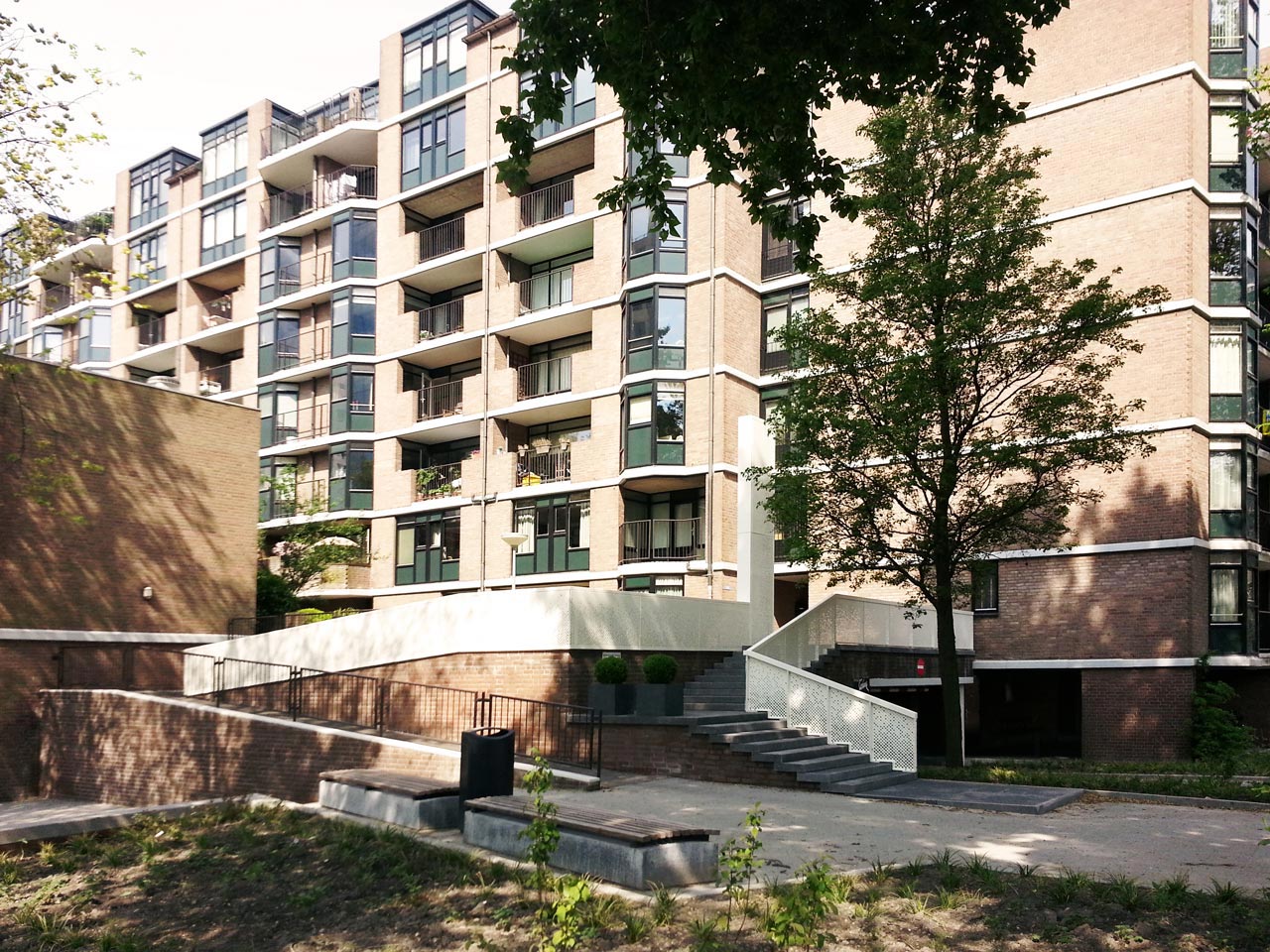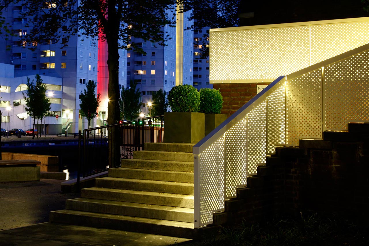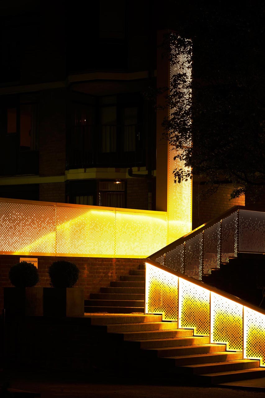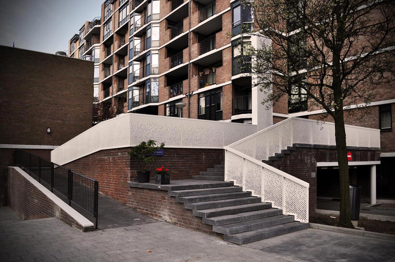 The new entrance stairs for a large housing block in the city centre of Rotterdam connects the public domain to an elevated semi private domain. We designed the new entrance with the idea of finding a balance between invitation and separation.