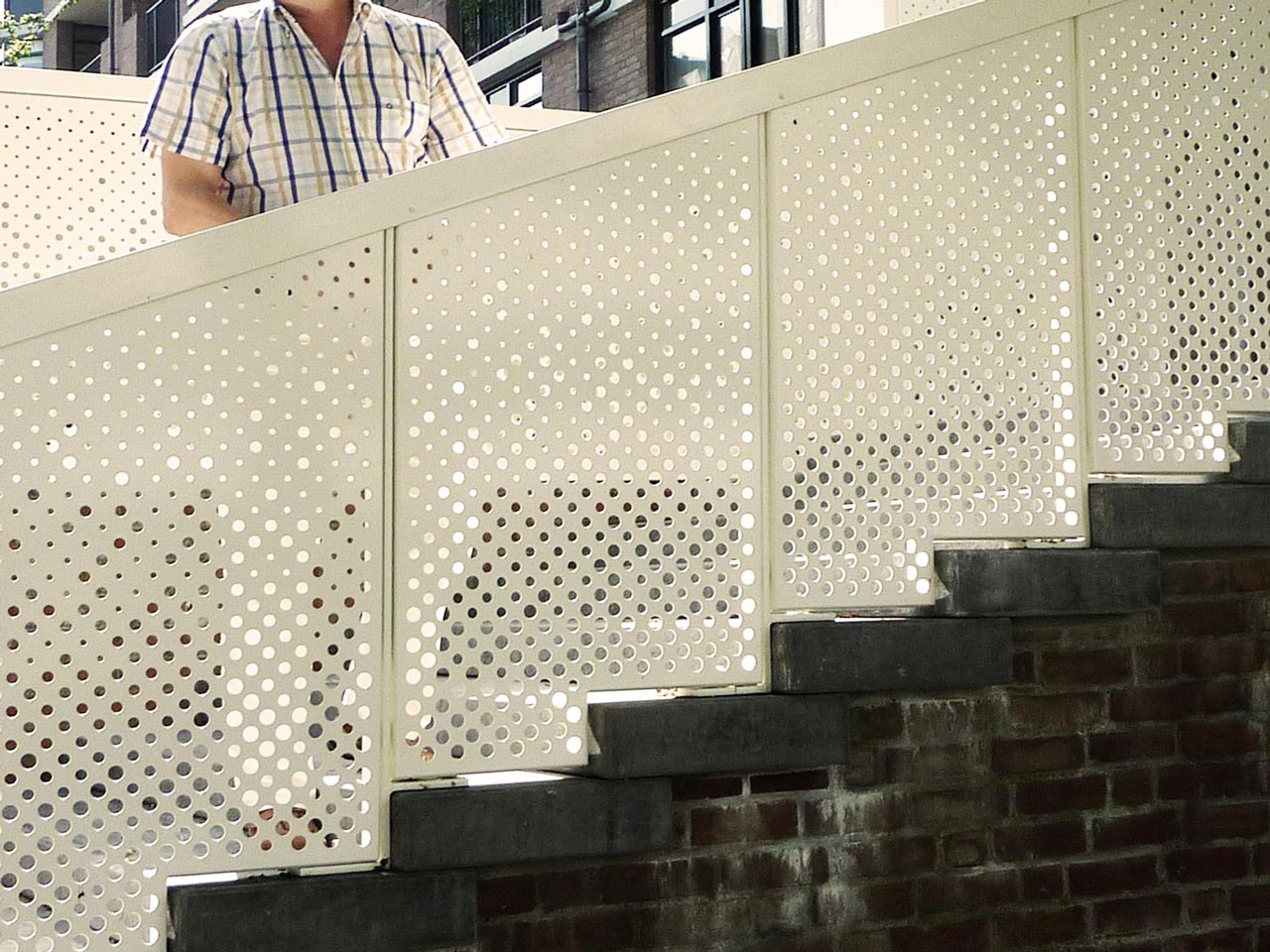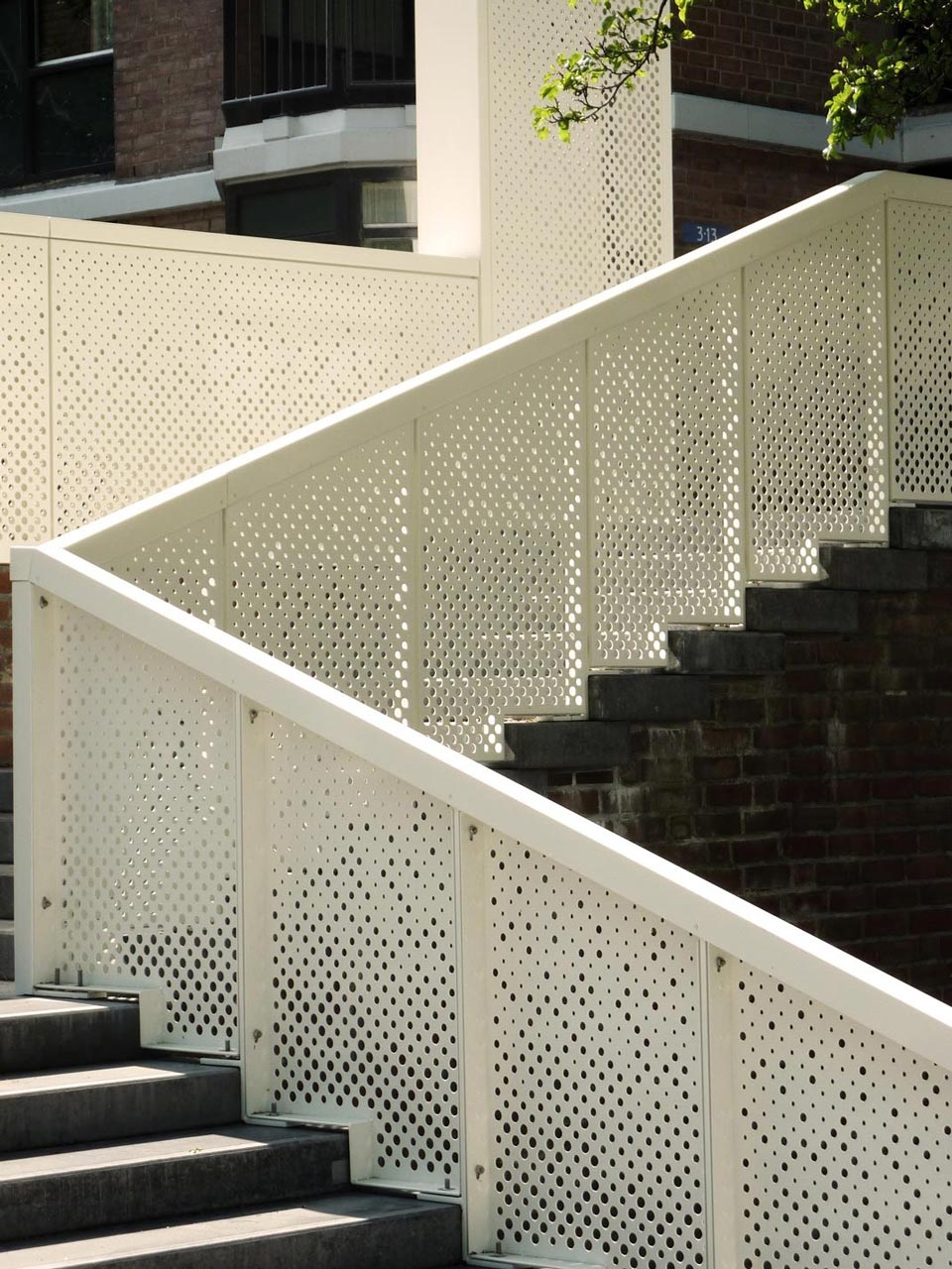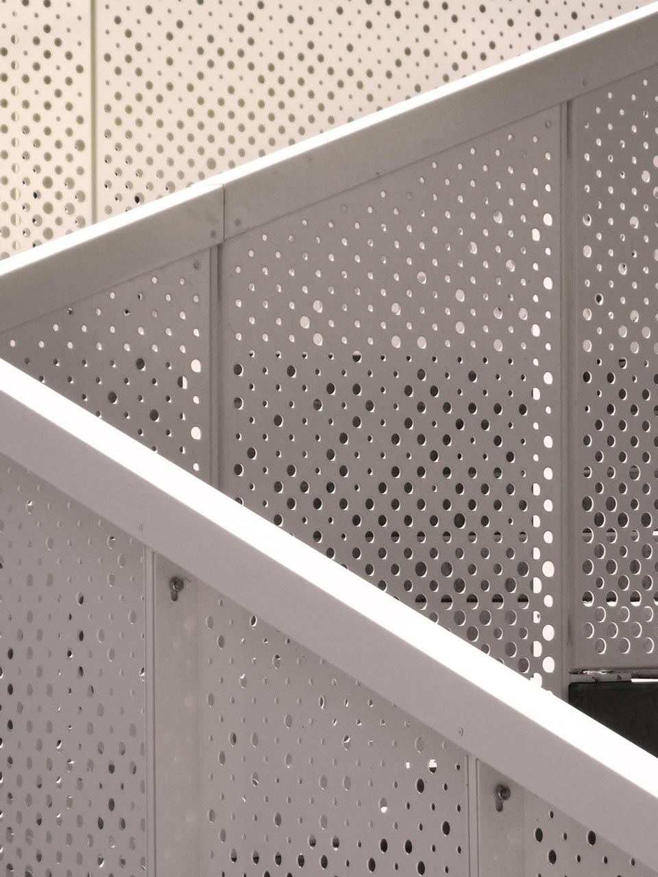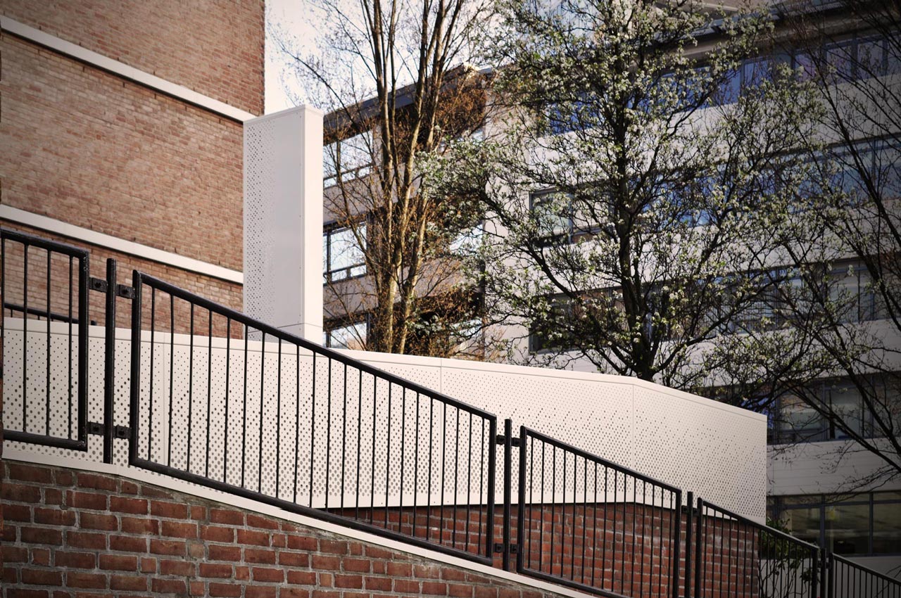 The hand rail that runs along the stairs and the upper deck is integrated into a solid white aluminum fence. The fence is randomly perforated, creating a subtle transparency. At night the fence illuminates and becomes a beacon of light in its context.