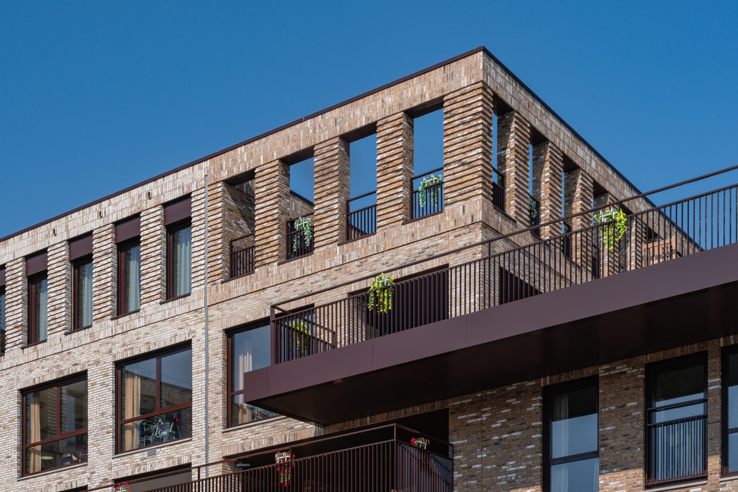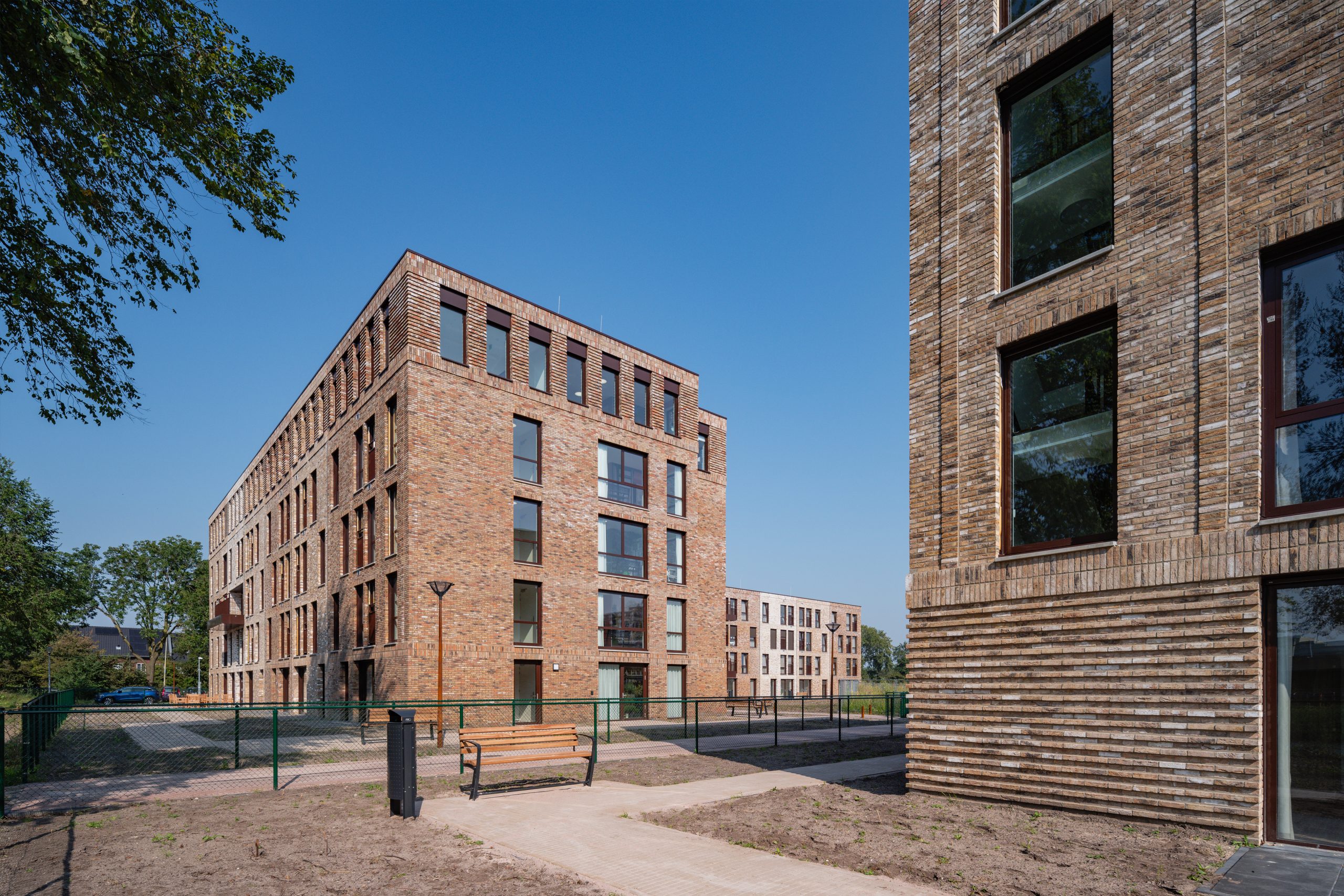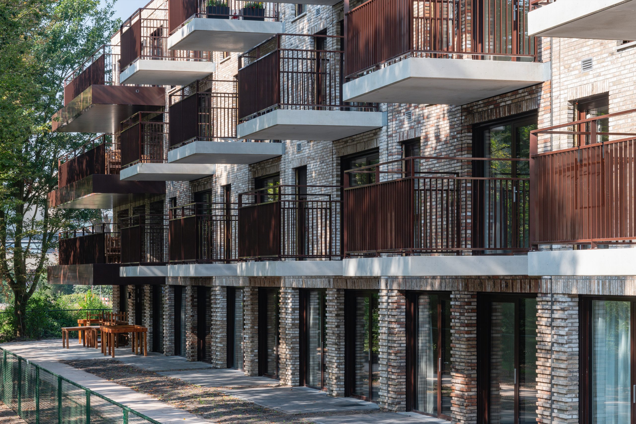 The facades are composed of a palette of light and brown stones, breaking up the large mass of the buildings and creating a more small-scale and diverse appearance. Towards the inner courtyard, large loggias are also located, providing ample outdoor space for each floor. The loggias are playfully placed in the facades, allowing residents to interact with residents on other floors. The bases of the buildings establish a direct relationship with the ground level and the private outdoor spaces. The base subtly distinguishes itself from the floors by using different window arrangements and materialization.