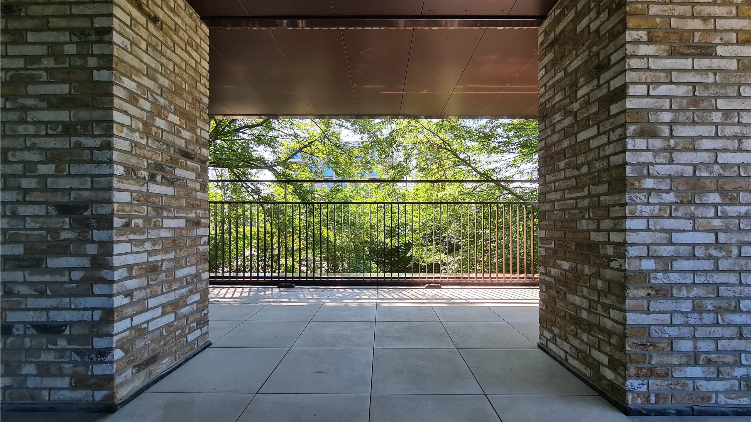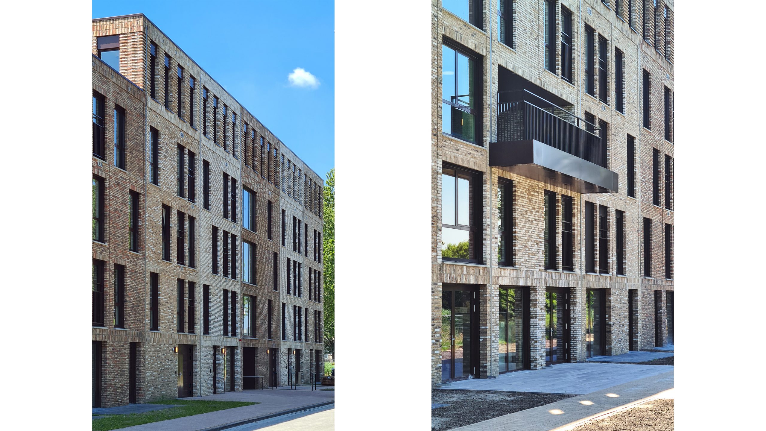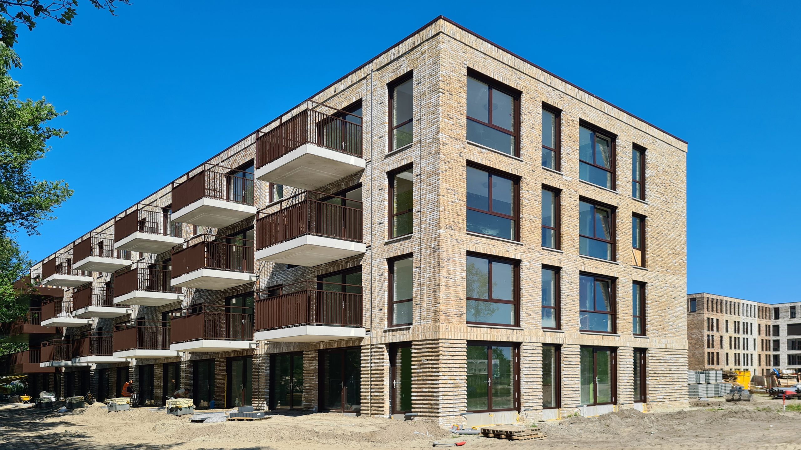 The facades are composed of a palette of light and brown stones, breaking up the large mass of the buildings and creating a more small-scale and diverse appearance. Towards the inner courtyard, large loggias are also located, providing ample outdoor space for each floor. The loggias are playfully placed in the facades, allowing residents to interact with residents on other floors. The bases of the buildings establish a direct relationship with the ground level and the private outdoor spaces. The base subtly distinguishes itself from the floors by using different window arrangements and materialization.
