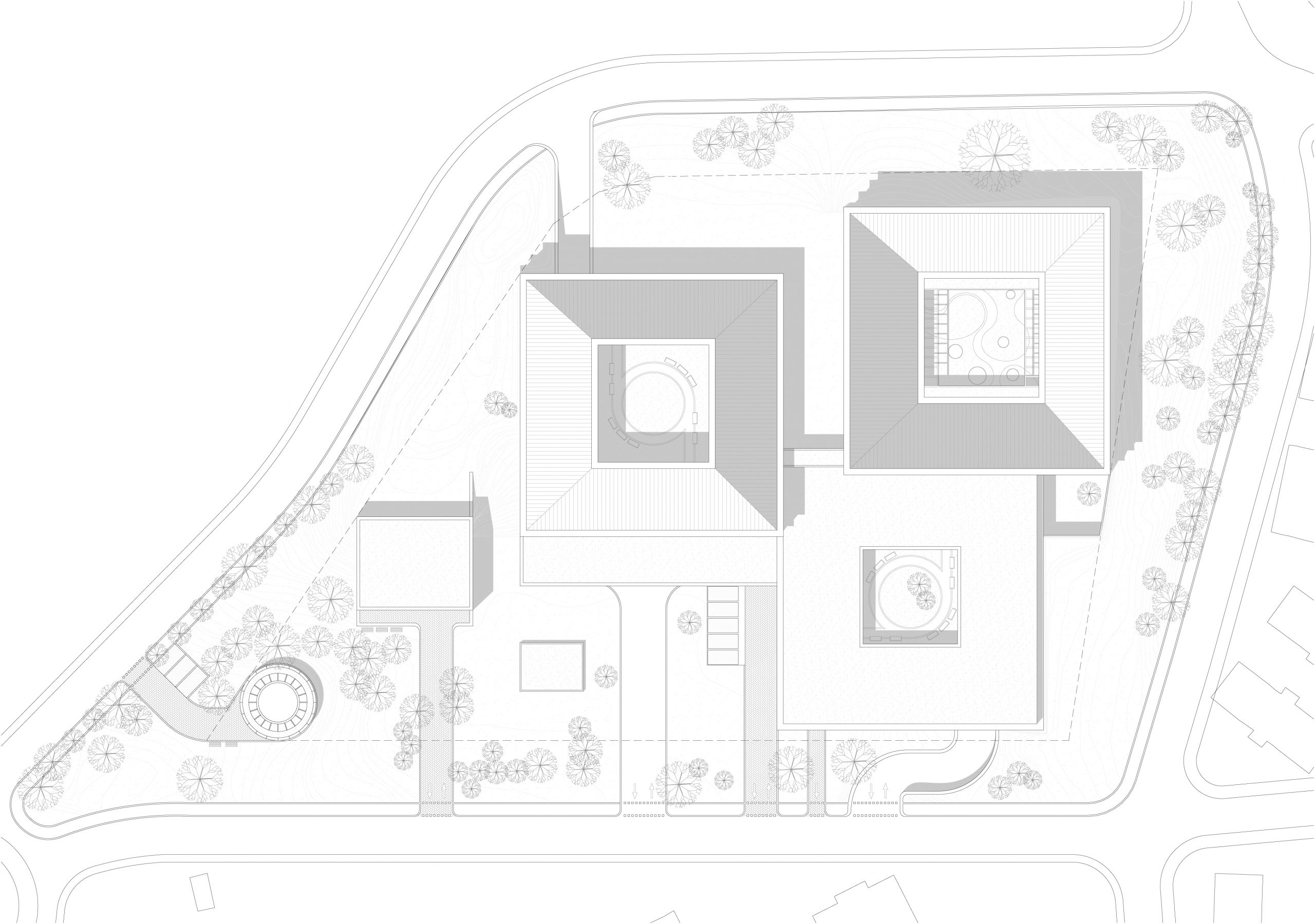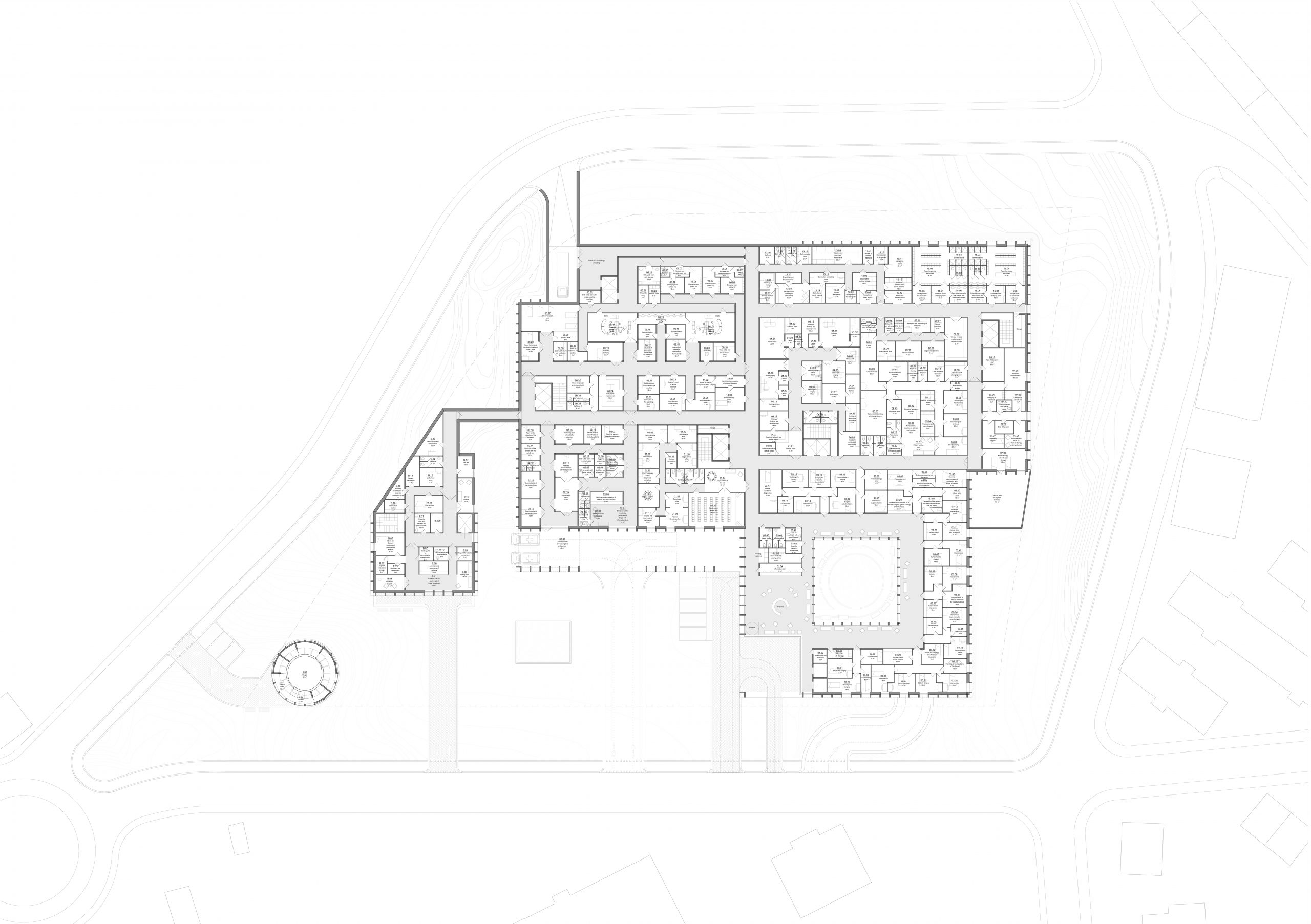 The hospital not only embraces the nature outside, but also creates a natural environment inside. The large courtyards in all 3 main volumes are designed as green spaces that connect the different programs and make the hospital feel like a walk in the woods. The courtyards also give a lot of light and fresh air to spaces that normally cannot receive light and fresh air due to the size of hospitals. Furthermore the courtyards give identity to the different volumes and create a clear distribution system.From and urban and landscape perspective the hospital is situated in such a way that there is an even distribution of green on all sides. One of the main goals was to preserve as much trees as possible. By planting more trees a park like environment around the hospital is created that even has some parts that work as public spaces with resting areas and public paths leading through the forest. The architecture of the hospital contributes to the park environment due to it’s shape, size and materialization. Inside the park the hospital program is spread out in 5 different volumes. All the volumes are wooden buildings that are resting on a plinth made from local stones. The stone plinth connects 4 buildings apart from the mortuary. The mortuary is placed inside the area that has the highest density of trees. There it sits, separated from the rest, like a chapel in the forest. The mortuary provides a secluded place for memorizing the loved one who passed away. A round shape is chosen for this building that resembles the cycle of life. Further up the hill the building for infectious diseases is situated. This building keeps a clear distance from the main hospital, but does have a connection through the stone plinth. The main hospital is situated in the 3 pavilions. All buildings together provide a calm and natural appearance against the background of the green mountains.